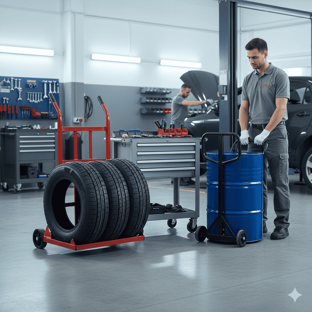 Heavy-duty workshop tools ensuring safety when handling tires, oil drums, and mechanical parts.