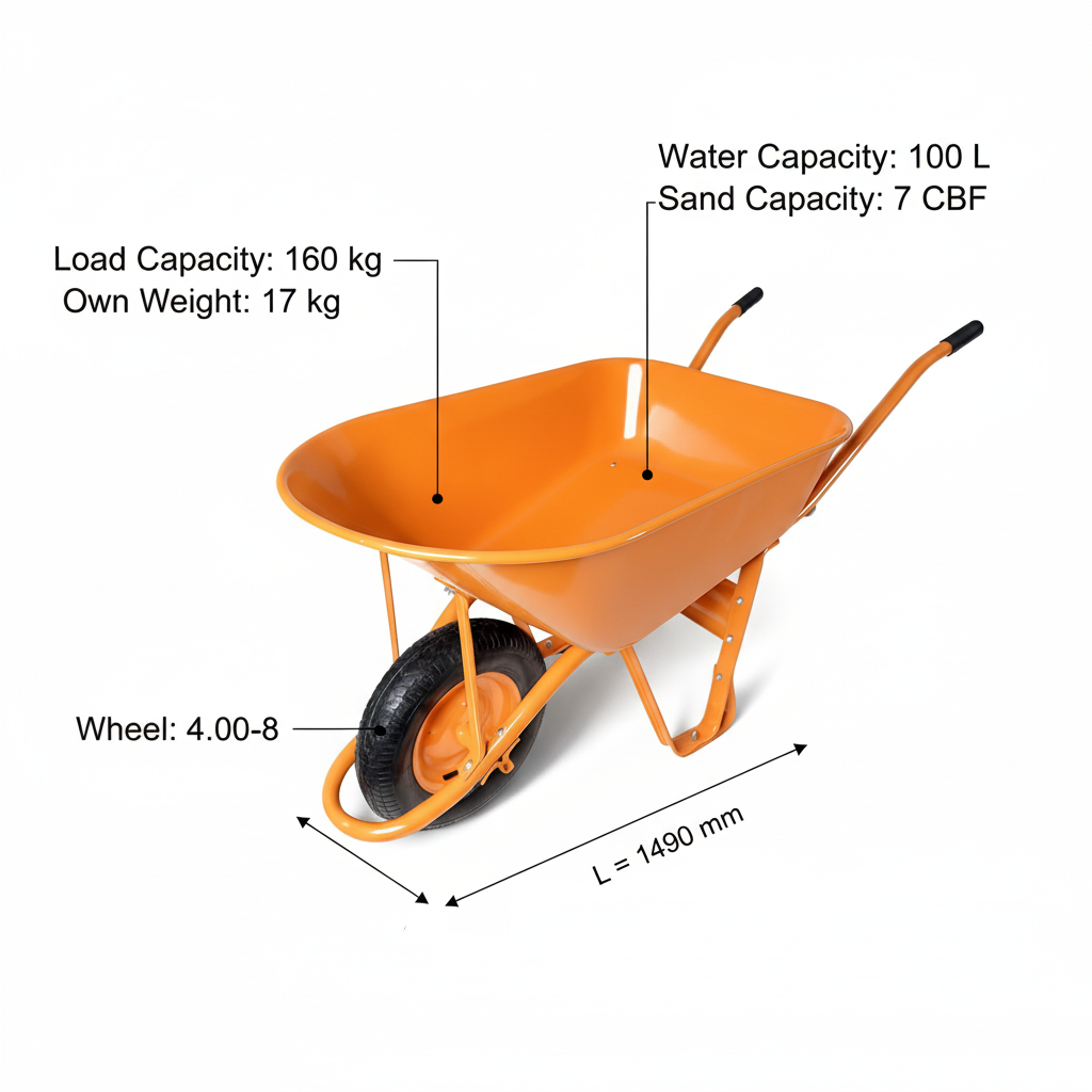 The core strength of the WB7402 lies in its precise manufacturing specifications. It features a spacious tray with a water capacity of 100 liters and a sand capacity of 7 cubic feet (CBF). This volume is ideal for mixing and transporting bulk materials. The tray is supported by a sturdy frame that distributes weight evenly over the wheel, minimizing user fatigue.