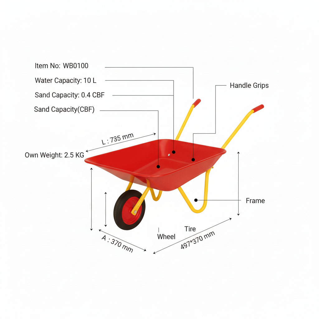 The WB0100 is engineered with safety and usability as top priorities. While it boasts a 10L Metal Kids Wheelbarrow form factor, the specifications reveal a thoughtful balance of weight and capacity. The unit features a lightweight 2.5kg frame, ensuring that it is manageable for children without compromising structural integrity. The 5kg load capacity is perfectly calibrated for moving light garden debris, dry leaves, or sand, preventing strain on young users.
