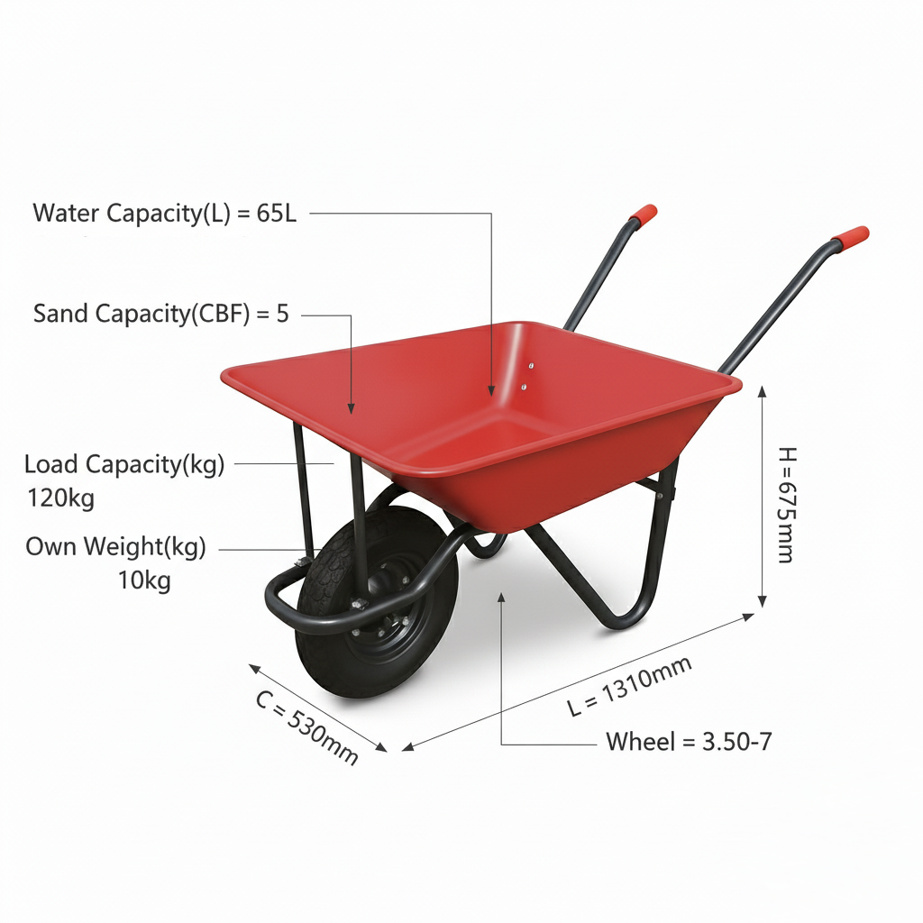 The 65L Galvanized Wheelbarrow WB4211 is built upon a precision-engineered tubular chassis that supports a substantial 120kg load capacity. The 65-liter water capacity tray is the centerpiece of this model, pressed from high-grade steel and treated with a specialized galvanized coating. This process involves applying a protective zinc coating to steel or iron, specifically to prevent rusting, which is critical for equipment exposed to wet soil and outdoor elements (learn more about Galvanization processes here). The unit features a 3.50-7 pneumatic wheel, which provides excellent shock absorption over uneven terrain, ensuring stability whether moving gravel or mulch. The overall dimensions of 1310×675×530 mm are optimized for narrow pathways often found in residential gardens and nursery rows.