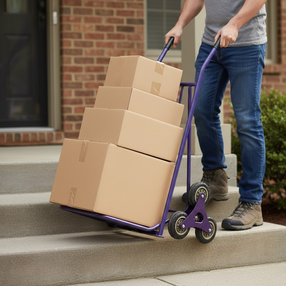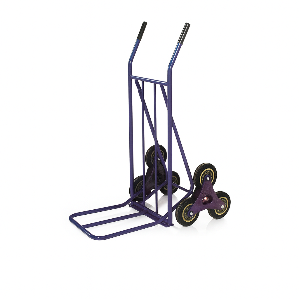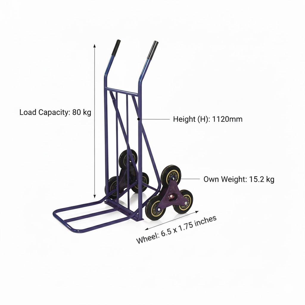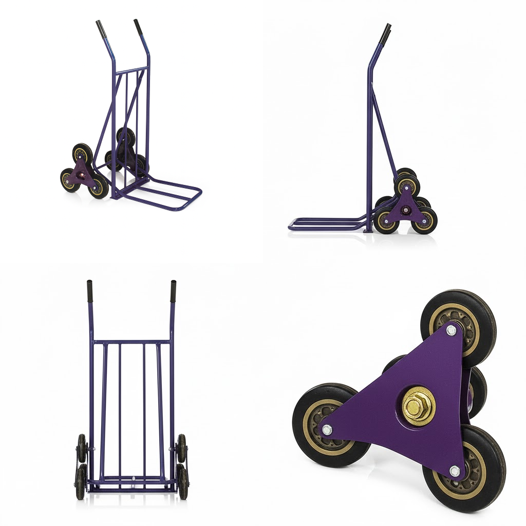 Built with a reinforced steel frame 和 tri-wheel rotating design on each side, it distributes weight evenly to reduce strain during lifting. Each wheel cluster rotates independently, allowing the trolley to “walk” up steps with minimal effort — ideal for deliveries, warehouses, and multi-story operations.